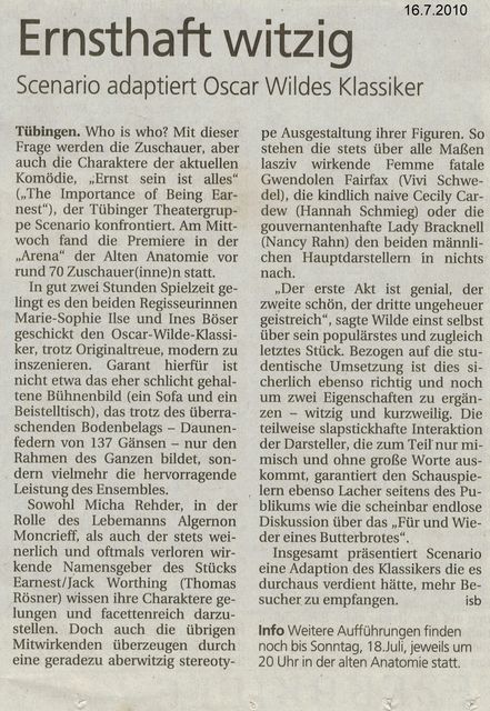 Die Theatergruppe Scenario spielte vom 14. bis 18. Juli Ernst sein ist alles (The Importance of Being Earnest) von Oscar Wilde. Wir möchten uns an dieser Stelle herzlich beim wundervollen Publikum bedanken, dass zahlreich kam und gute Laune mitbrachte.